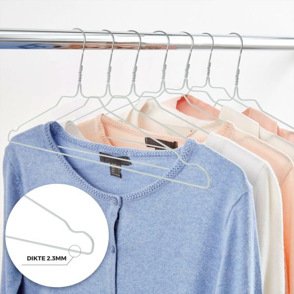 Met deze 50 stuks wit kledinghangers breng je orde in jouw kledingkast. Door het extra dunne model van 2,3mm nemen de wit kledinghangers weinig ruimte in jouw dressoir. Ondanks de dikte zijn deze kledinghangers stevig genoeg om een winterjas mee op te hangen.