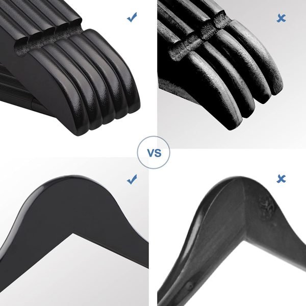 Meer ruimte in je kast: Deze luxueuze houten hangers hebben een slank ontwerp zonder concessies te doen aan stevigheid. Bovendien zijn de zijkanten van de hangers afgeplat om nog meer ruimte te besparen. Je zult verrast zijn hoeveel er werkelijk in je kledingkast past!